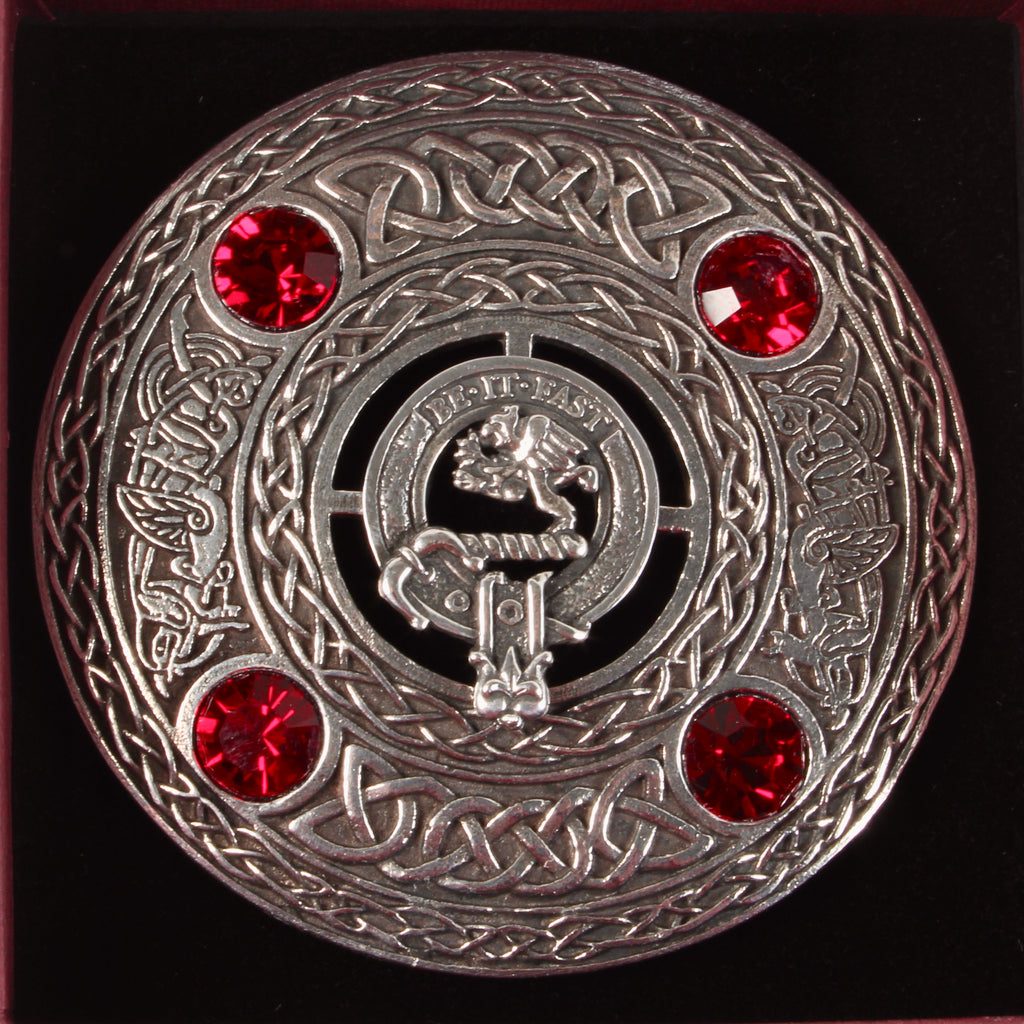 These clan crest plaid brooches are made from pewter and each crest is approved by the Standing Council of Scottish Chiefs. The brooch has a characteristically Celtic design around the crest, as well as four coloured stones.