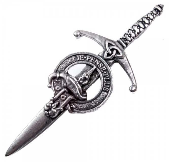 This pewter broadsword style kilt pin has an antique palladium finish and comes in a range of more than 200 clan crests.
