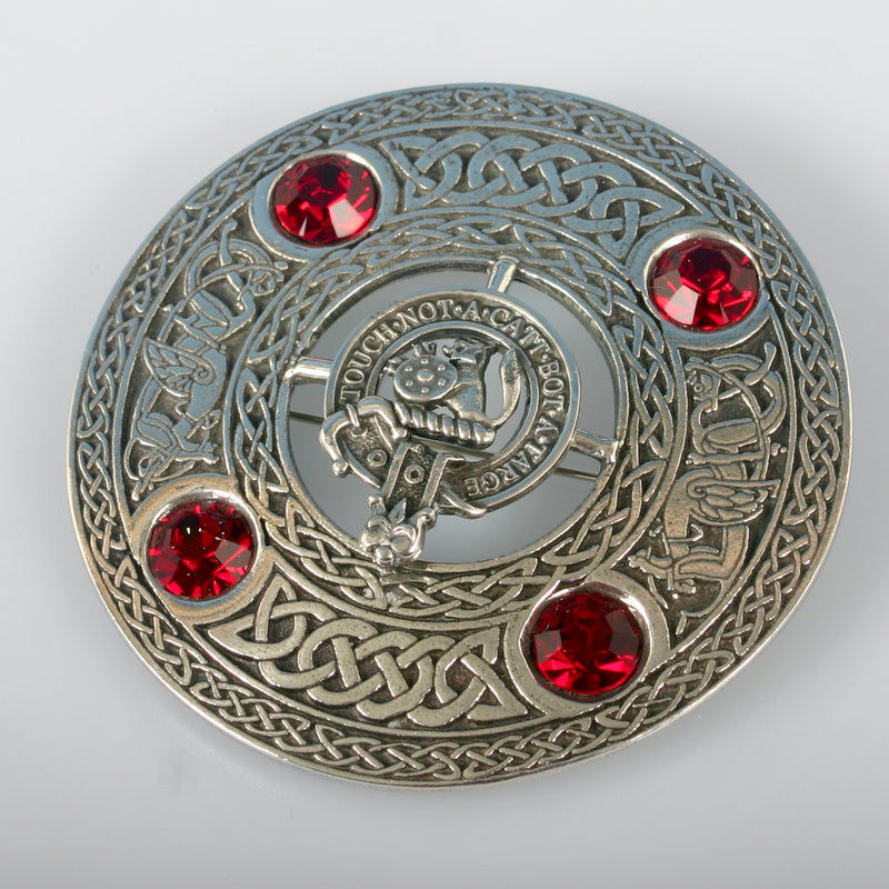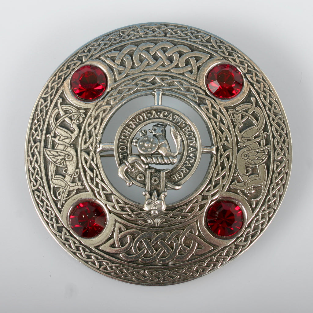 These clan crest plaid brooches are made from pewter and each crest is approved by the Standing Council of Scottish Chiefs. The brooch has a characteristically Celtic design around the crest, as well as four coloured stones.