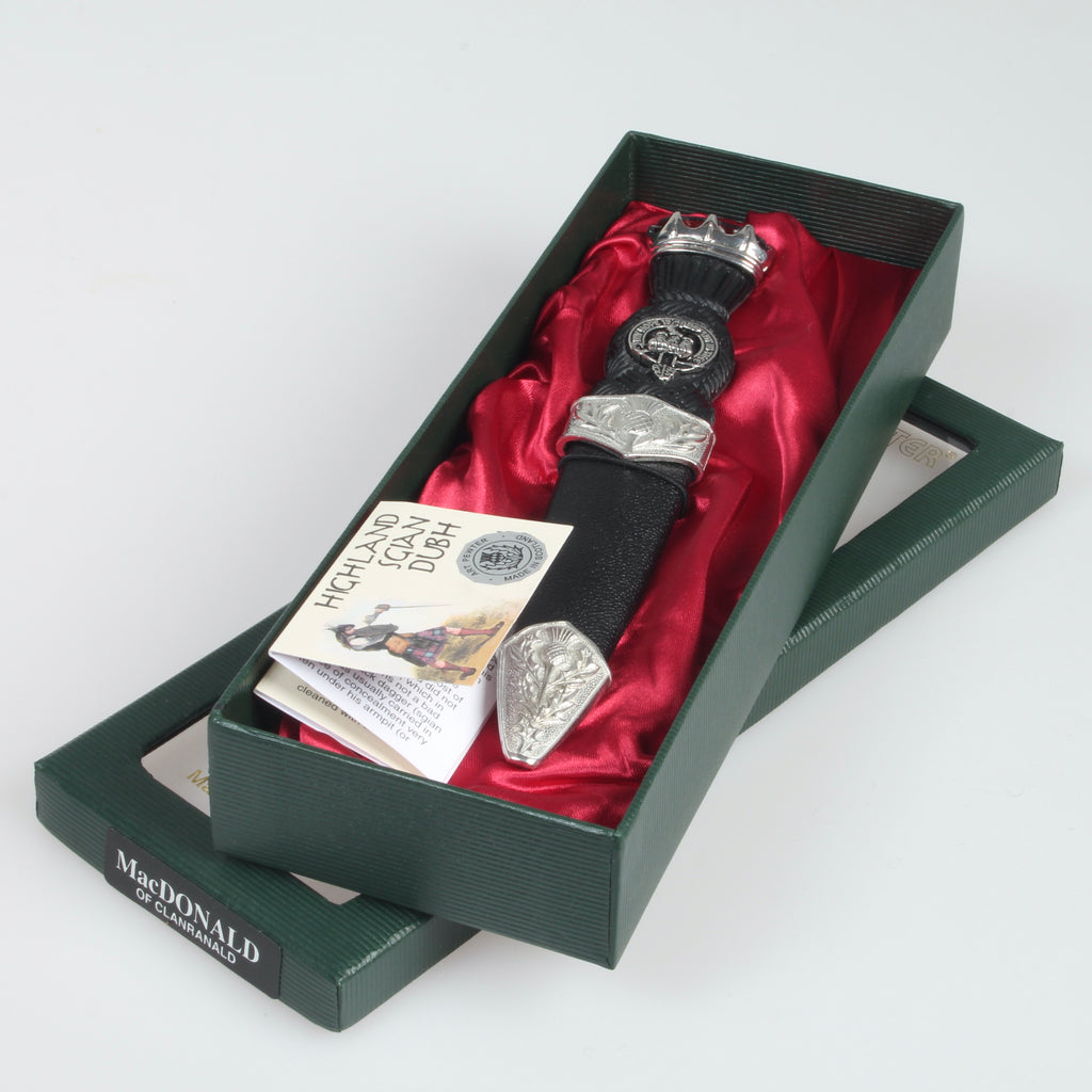 Experience the pride and elegance of Scottish culture with the MacDonald of Clanranald Clan Crest Stone Top Thistle Design Sgian Dubh. Order yours today and add a touch of Scottish tradition to your life!