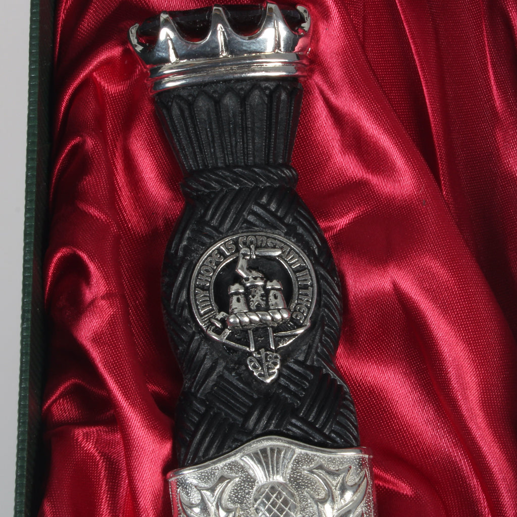 This sgian dubh features an ebony-effect handle with an intricate pewter Celtic design, a stainless steel blade, and a Celtic design scabbard. The traditional amber stone on top adds a touch of elegance and authenticity. The handle is adorned with a pewter clan crest badge, representing over 150 available clans. It is presented in a box with a clear top and satin lining, making it the perfect gift for any occasion.