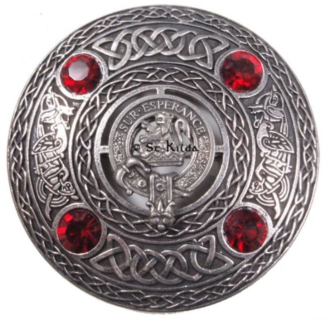 These clan crest plaid brooches are made from pewter and each crest is approved by the Standing Council of Scottish Chiefs. The brooch has a characteristically Celtic design around the crest, as well as four coloured stones.