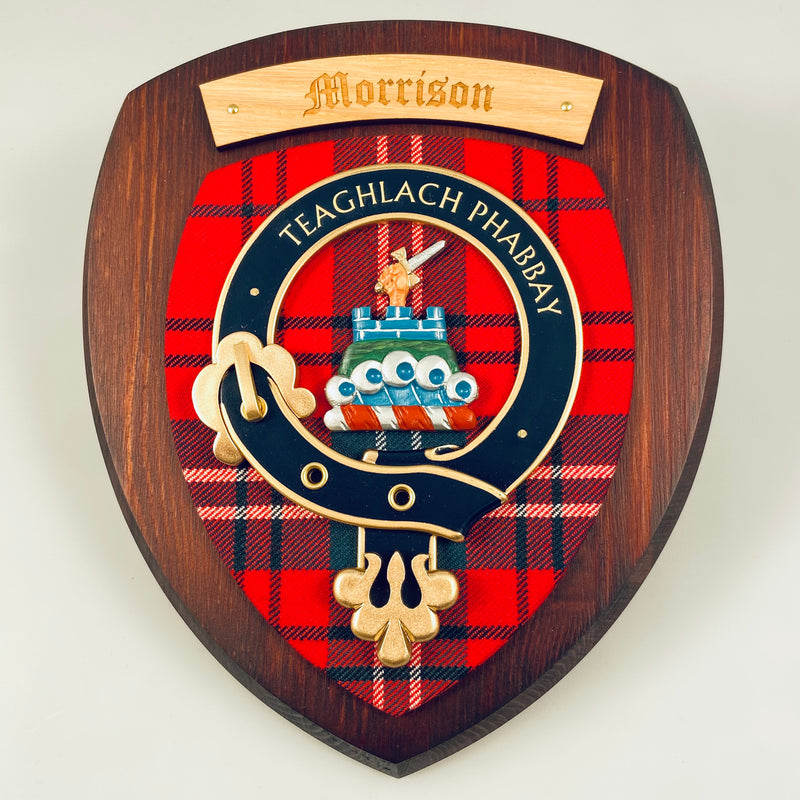 Our Clan Crest Wall Plaque. Handmade in Glasgow, Scotland. This is as Scottish a product as anyone could ever hope to own - from the Hardwood shield to the tartan itself. All the unique designs have been approved by the Standing Council of Scottish Chiefs. Size: 7" x 8" approx. As this plaque will be made to order just for you please take note of the delivery notice to the right of this description. Tartans can vary as to what tartan is available at the time of making but will be the tartan for the clan. If you want a specific tartan just drop us an email with your order number and we will do our absolute best to make this happen. A perfect gift for yourself or loved ones!