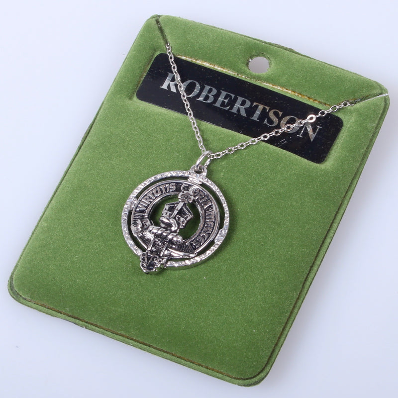 Show off your Scottish heritage with our stunning Robertson Clan Crest Pendant. With over 120 crest options to choose from, this pewter pendant with a palladium finish is the perfect accessory to express your pride. Whether you're attending a traditional Scottish gathering or simply want to add a touch of your ancestry to your everyday look, this pendant is a must-have.