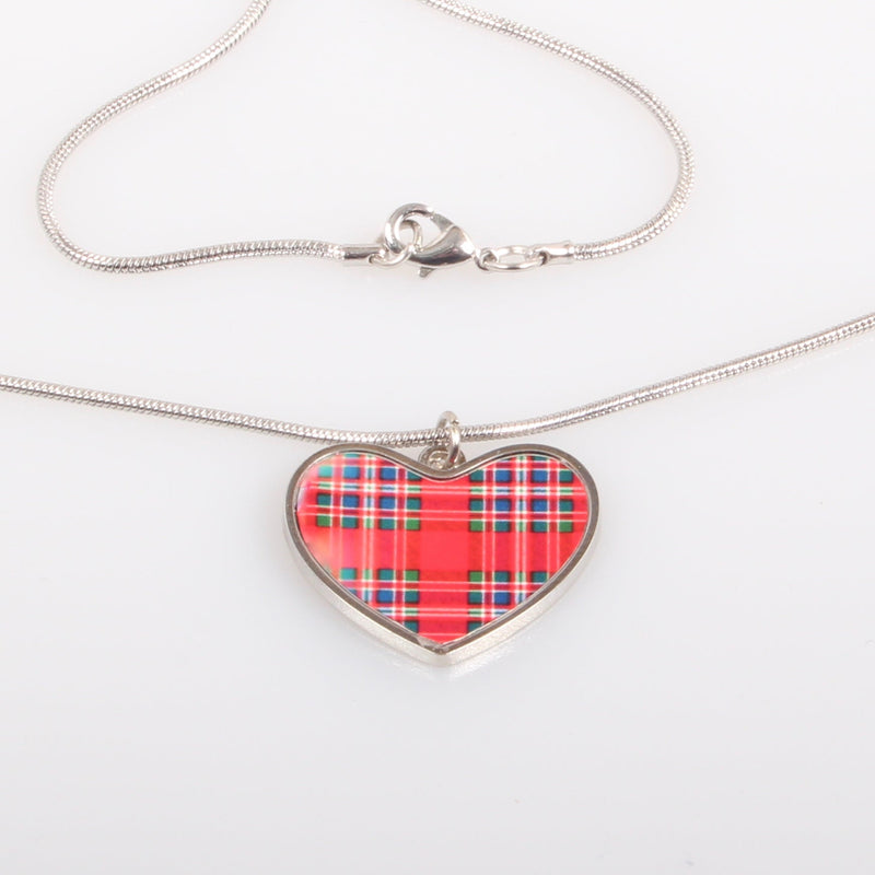 Chrome finish necklace with tartan heart design centre. Printed to order in any of our huge list of tartans. We can also custom make these with ANY tartan design even if its not listed (subject to minimum order of 5 pieces).