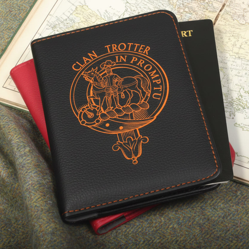 Looking to travel in style? The Trotter Clan Crest Leather Passport Cover is the perfect companion for your worldly adventures. Made from genuine leather, this passport cover not only adds a touch of sophistication but is also built to withstand the test of time.