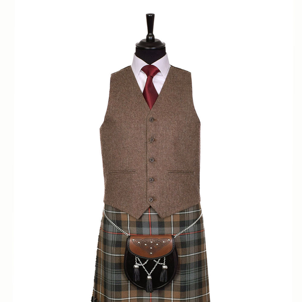 Our brown tweed kilt jacket and waistcoat sets are the ideal complement to tartans in rich, earthy autumnal tones. These sets not only enhance the natural warmth of the tartan but also offer a timeless, sophisticated look that effortlessly blends tradition with modern style. Whether for a semi-formal event or a more casual gathering, the textured brown tweed adds depth and character, making it a versatile choice for most occasions.