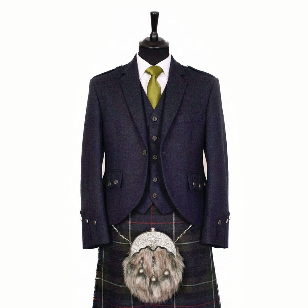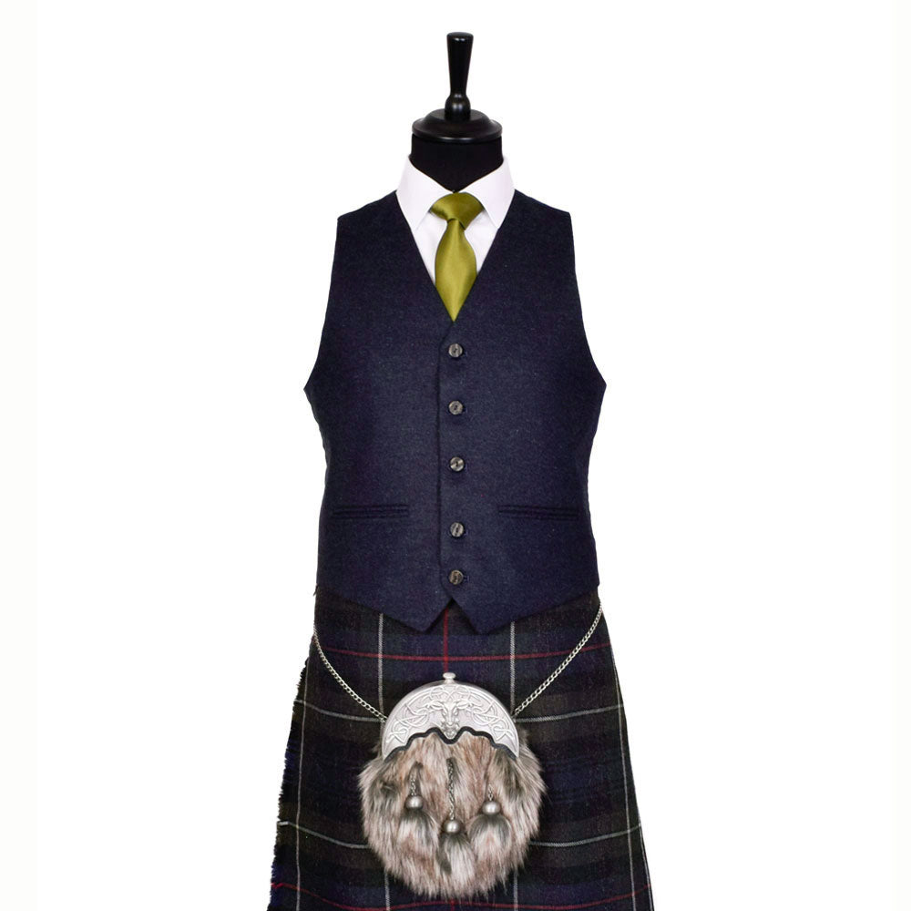 Our Elgin Blue tweed is a deep herringbone tweed. The darker blue shade is ideal for pairing with blue-based Modern colourway tartans, or for a contrast with ancient ones with a light blue base.