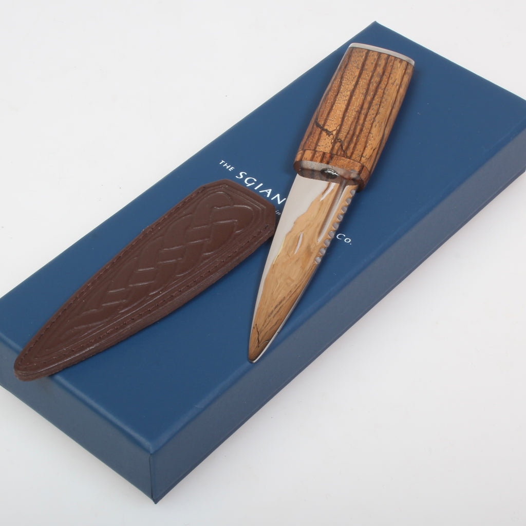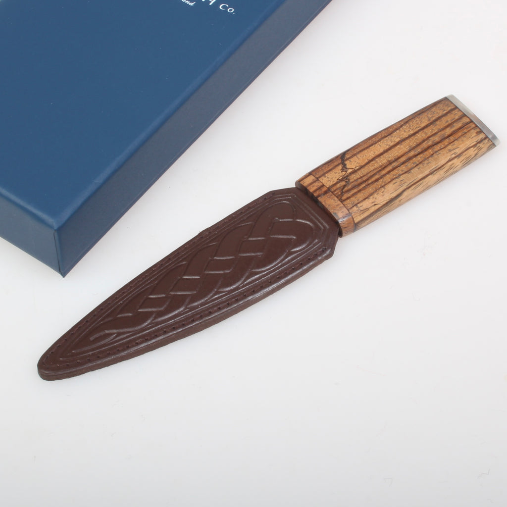 Handcrafted in Scotland with utmost attention to detail, this Sgian Dubh boasts a stainless steel blade that ensures durability and precision. The stunning zebrano wood handle not only provides a comfortable grip but also showcases the natural beauty of this remarkable wood.