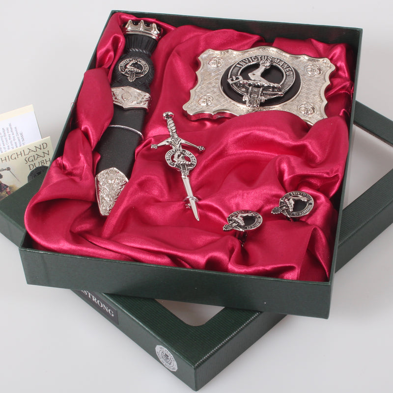 The set includes a pewter belt buckle, pewter cufflinks, a kilt pin, and a stunning sgian dubh with a stainless steel blade. Each accessory features your choice of clan crest, adding a personal touch to your outfit.
