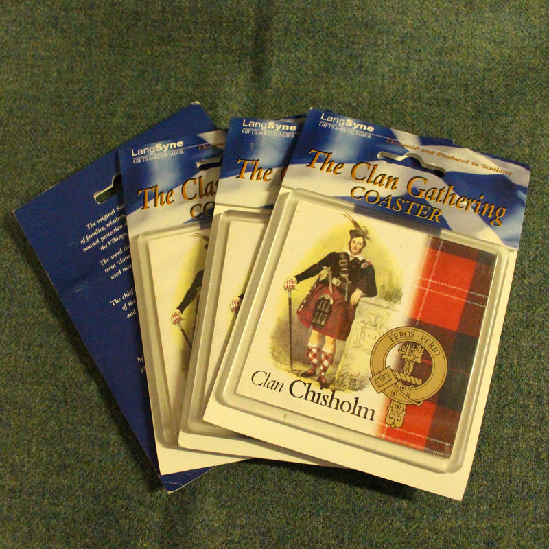 Upgrade your home decor with the Chisholm Clan Crest Coasters Set of 4. Order now and add a touch of Scottish charm to your living space!