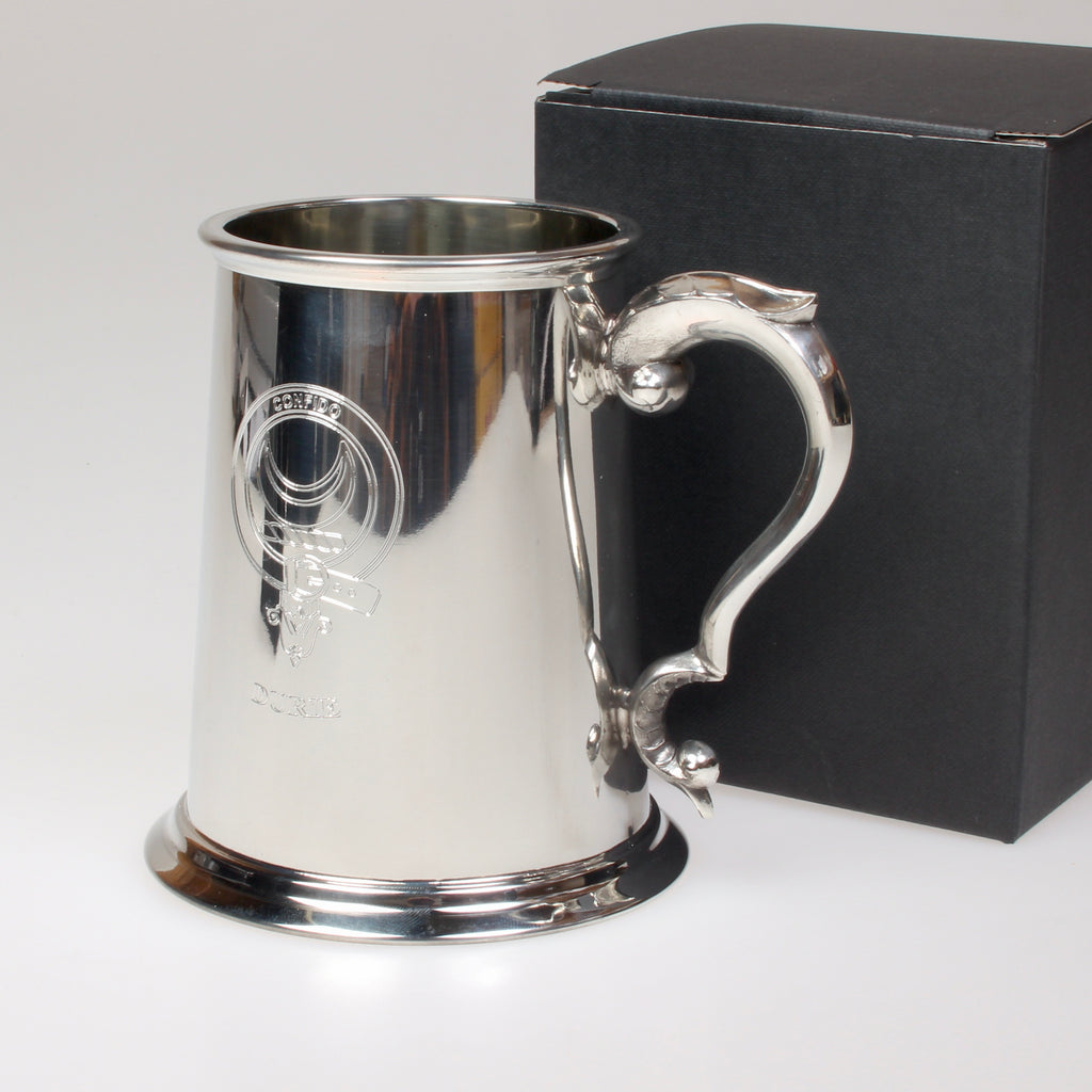 Celebrate your Scottish heritage with the Durie Clan Crest Engraved Pewter Tankard. Raise a glass and toast to Scotland with this impressive tankard, expertly crafted from pewter. Featuring the Durie Clan Crest, this tankard is a perfect addition to any family gathering or special occasion.