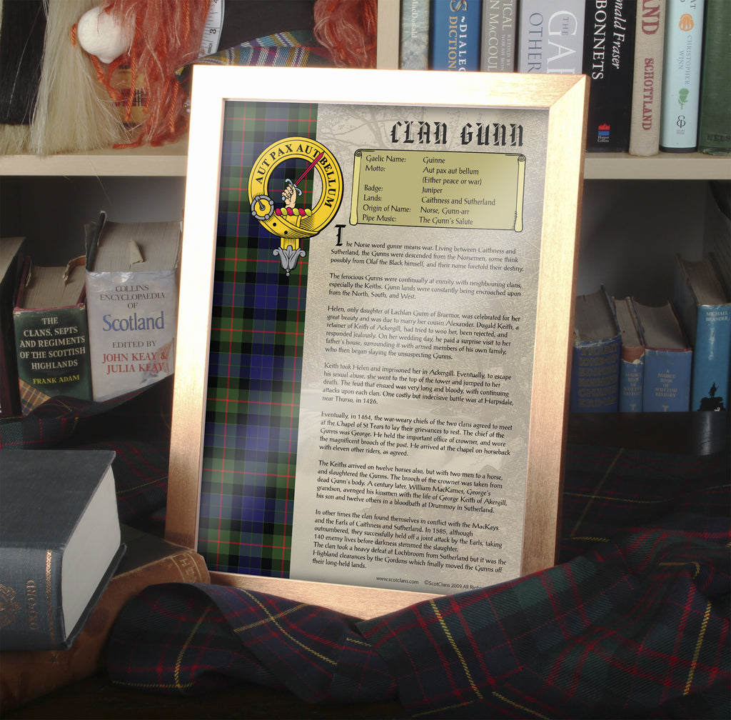 This clan history complete with crest and tartan is printed on 100gsm high quality parchment style paper.
