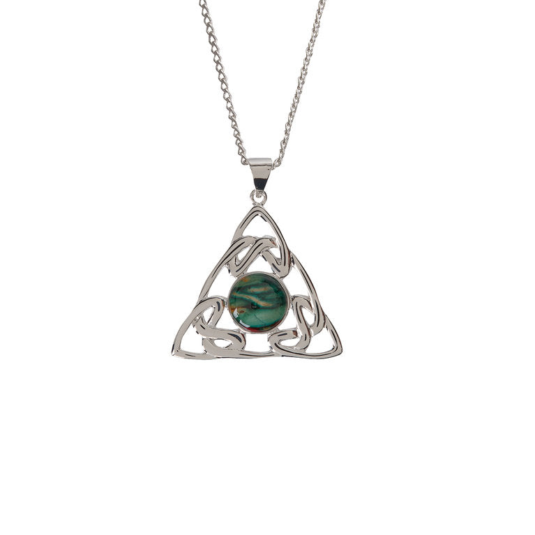 Expertly crafted in Scotland, this pendant showcases a delicate Trinity Knot design with dimensions of 35 x 31 mm. The centerpiece features a Heathergem measuring 10 x 10 mm, adding a touch of natural beauty to the pendant.