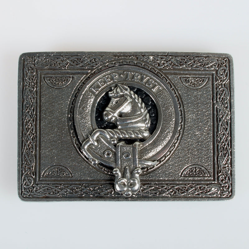 This stunning rectangular belt buckle is made from Pewter - a material used in Scotland for centuries - and comes with your clan crest as part of the central design.