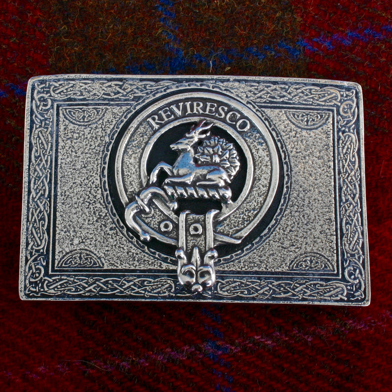 This stunning rectangular belt buckle is made from Pewter - a material used in Scotland for centuries - and comes with your clan crest as part of the central design.
