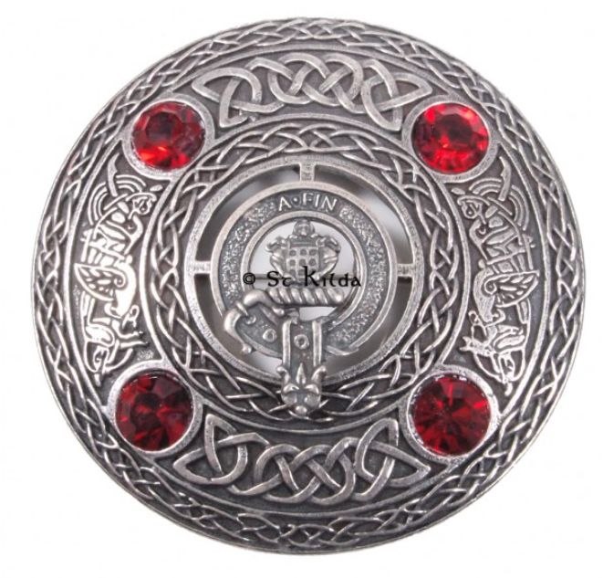These clan crest plaid brooches are made from pewter and each crest is approved by the Standing Council of Scottish Chiefs. The brooch has a characteristically Celtic design around the crest, as well as four coloured stones.