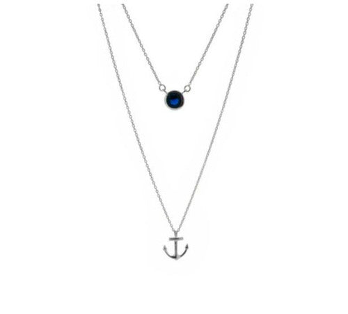 This stunning double chain necklace is inspired by the nautical theme from 'Voyager', the 3rd book in the Outlander series. Crafted with meticulous attention to detail, this necklace features a silver anchor pendant adorned with a beautiful sapphire coloured stone, exuding a sense of elegance and adventure.