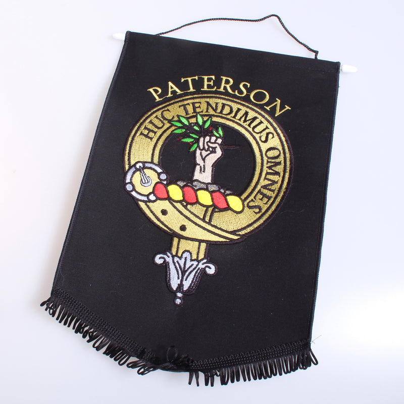 Elevate your home decor or proudly display your clan identity with the Paterson Clan Crest Embroidered Pennant. Order now and celebrate your heritage in style.