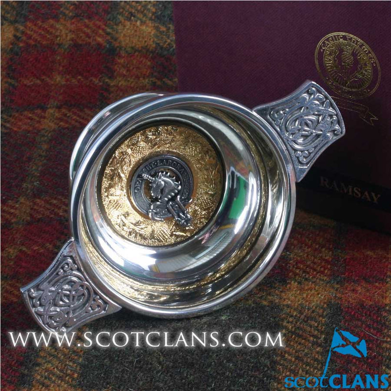 The quaich is made from the finest quality Pewter, with a Gold plated insert around the Clan crest of your choice.