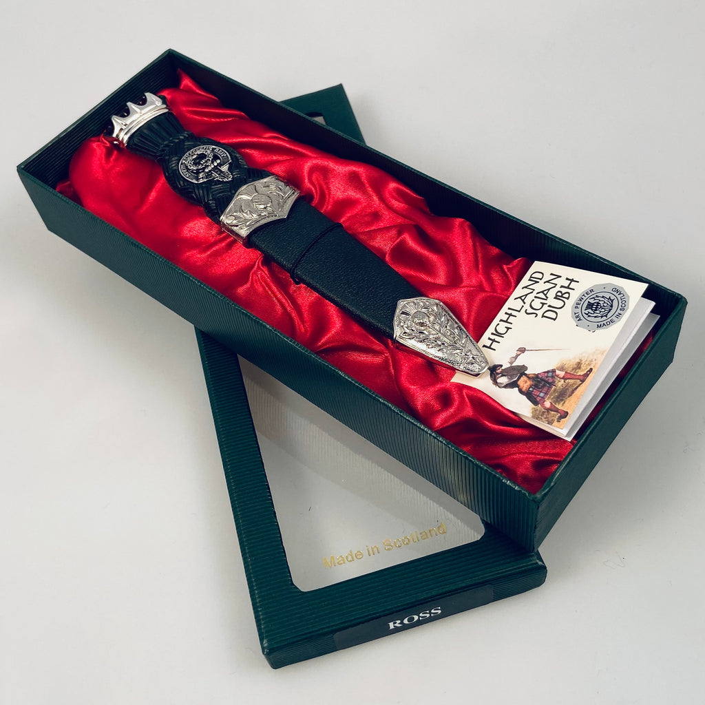 Embrace your Scottish heritage with the Ross Clan Crest Stone Top Thistle Design Sgian Dubh. Order yours today and add a touch of tradition and elegance to your Highland outfit.