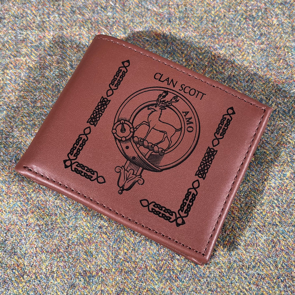 Our Scott Clan Crest Real Leather Wallet is made from soft and supple genuine leather, ensuring a luxurious feel that will only get better with time. The front of the wallet features a laser-etched crest, allowing you to showcase your clan with pride. Choose from a wide range of clans and personalize it to make it truly your own.