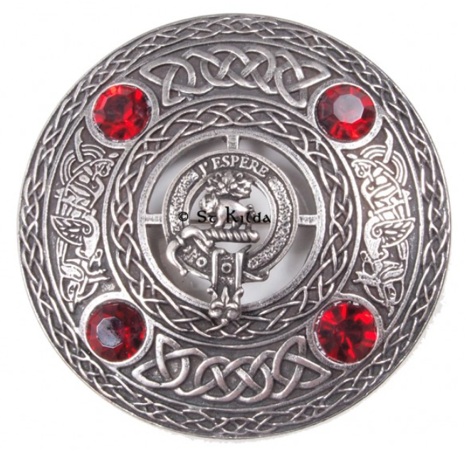 These clan crest plaid brooches are made from pewter and each crest is approved by the Standing Council of Scottish Chiefs. The brooch has a characteristically Celtic design around the crest, as well as four coloured stones.