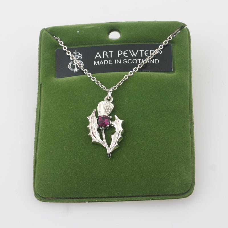 Stunning thistle design pendant in pewter - a material used in Scotland for centuries - with palladium coated finish. Size: approx 27mm high. Note: Stone colours may vary.